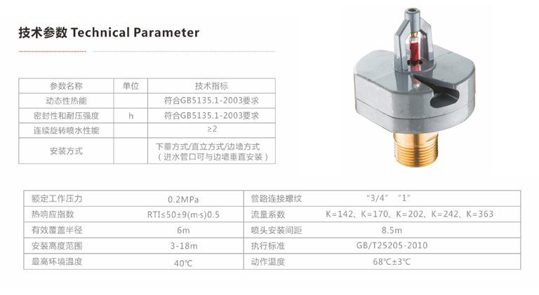 不采用感温玻璃球启动方式时,作为开式旋转型雨淋喷头使用,由雨淋阀控制喷头喷水。适用于根据GB50084标准设计的雨淋系统。